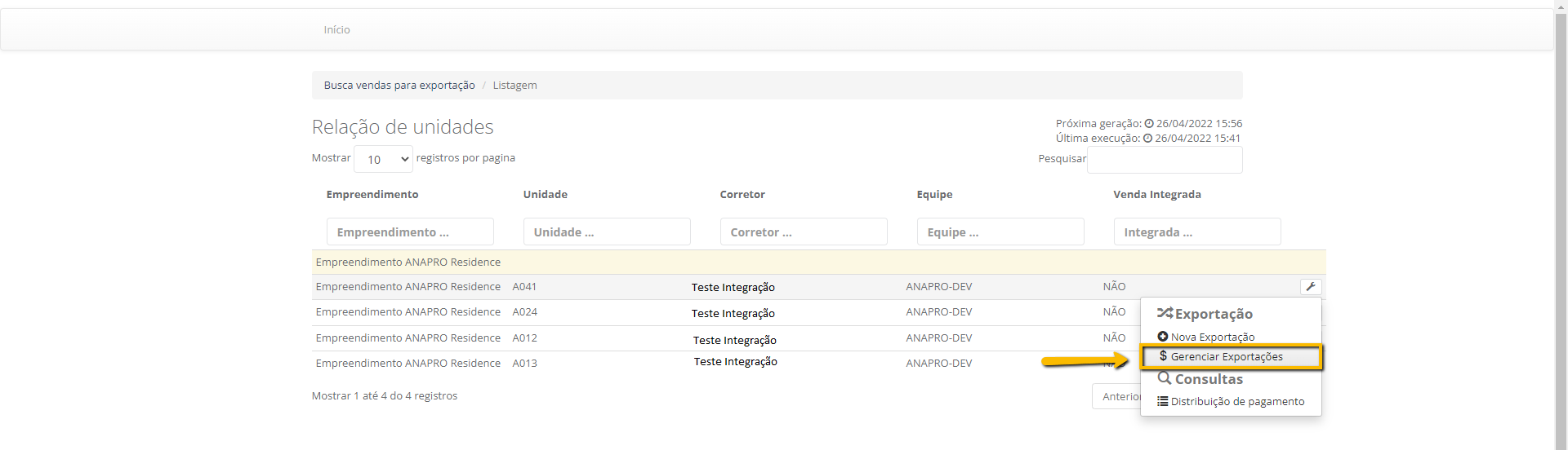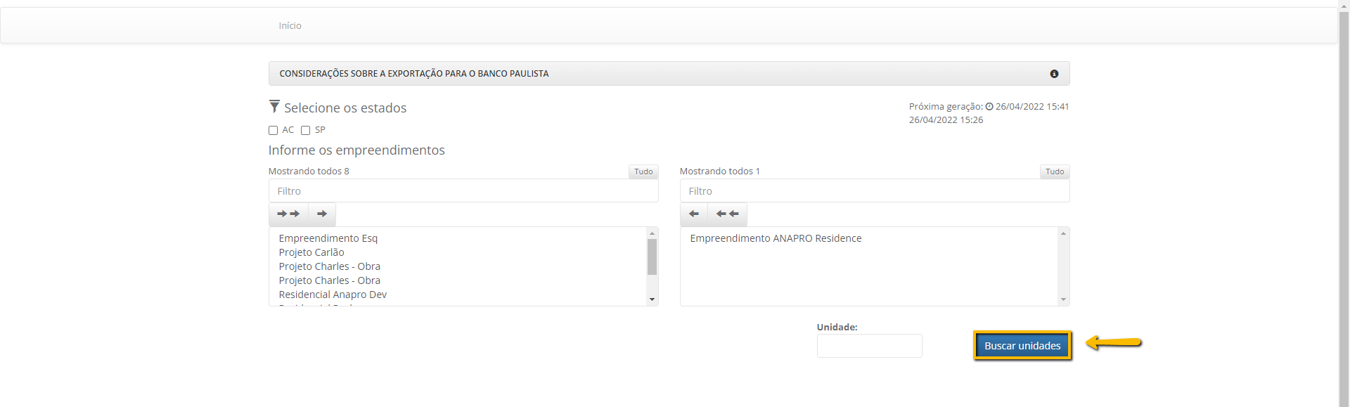 - Ao clicar no botão "Gestão da integração" irá abrir uma tela com dois filtros, o empreendimento que você irá selecionar e um campo "Unidade:" o qual você vai digitar o número da unidade em especifico e vai trazer a exportação, caso deixe o campo em branco irá trazer as exportações de todas as unidades do empreendimento marcado.