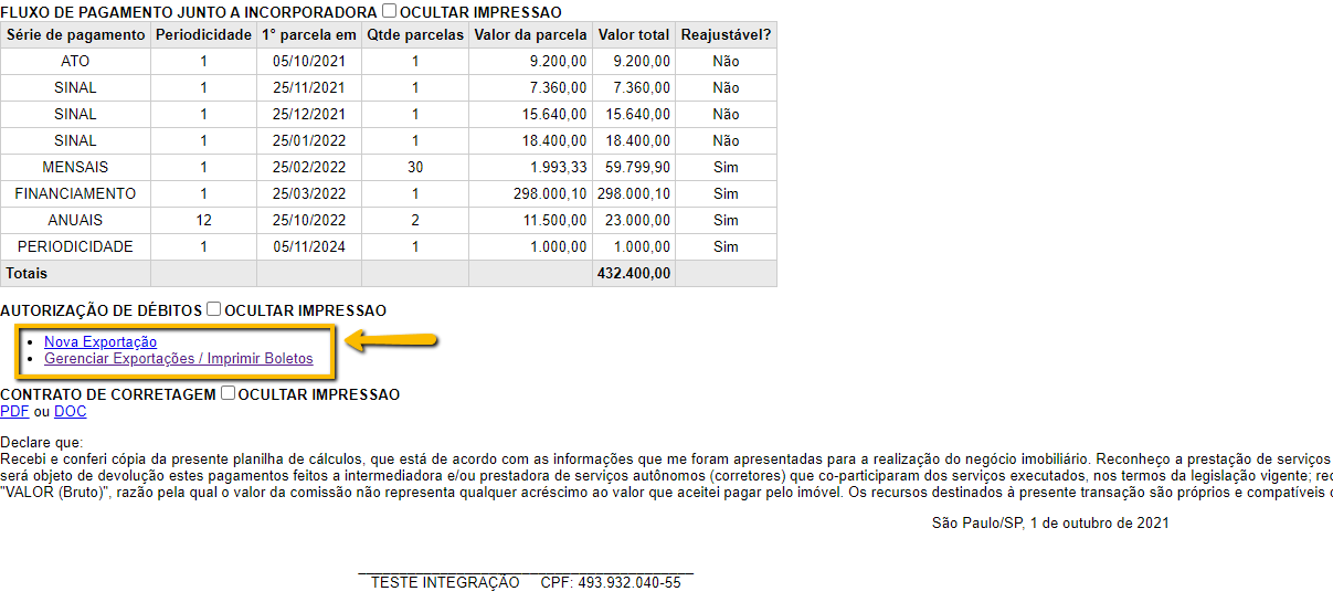 - Logo em seguida será aberto uma nova aba no navegador que é a "Memória de Cálculo" conforme explicações acima nesta tela mostra detalhadamente a distribuição de pagamento. Descendo a página clique em "Nova Exportação" conforme imagem abaixo indica.