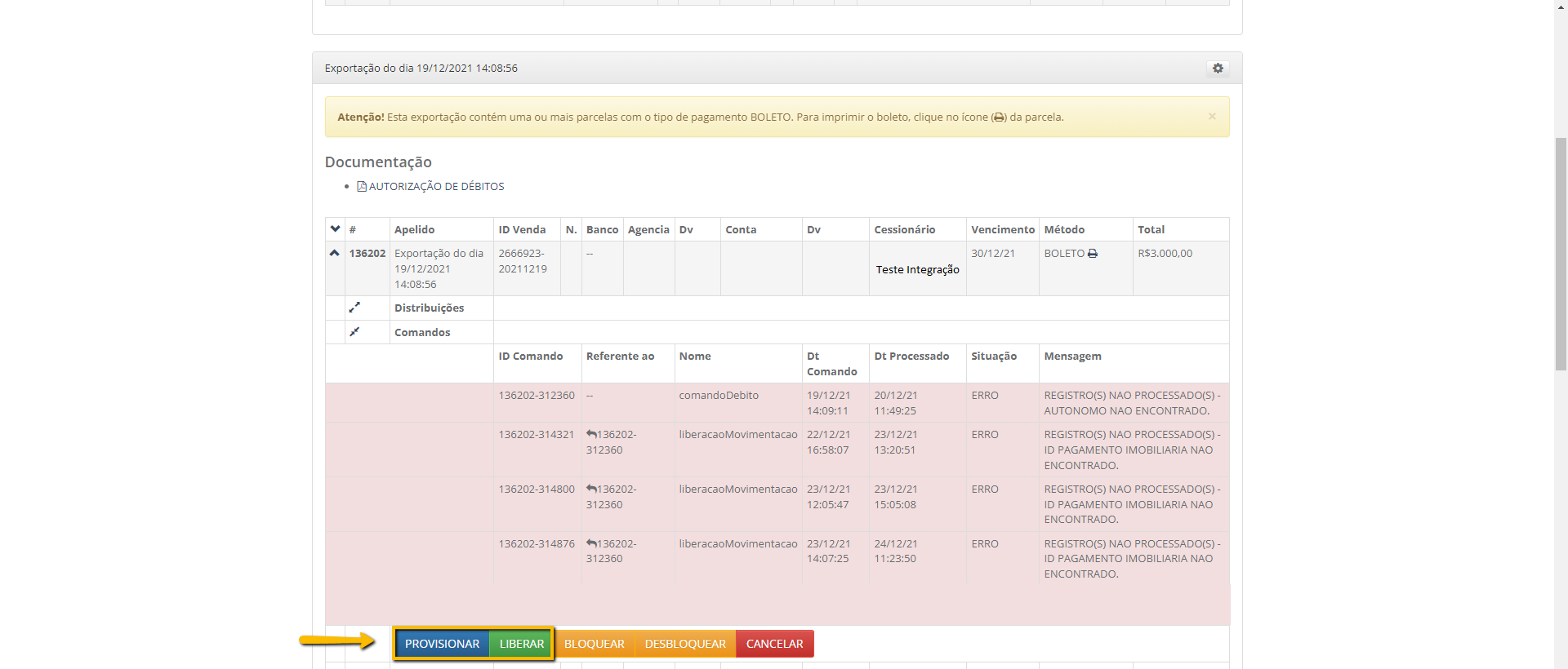 - Caso o "comandoDebito" dê erro no processamento, na coluna "Situação" irá descrever o erro e você entrará em contato com o suporte da integração para verificarem o erro e após solucionarem, irão lhe pedir para que deem o comando novamente clicando em "Provisionar", o mesmo serve para o comando de "liberacaoMovimentacao".