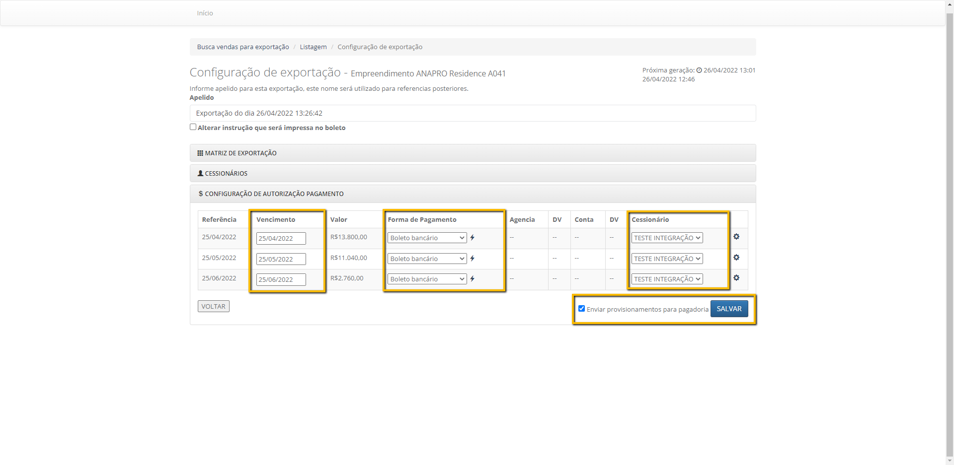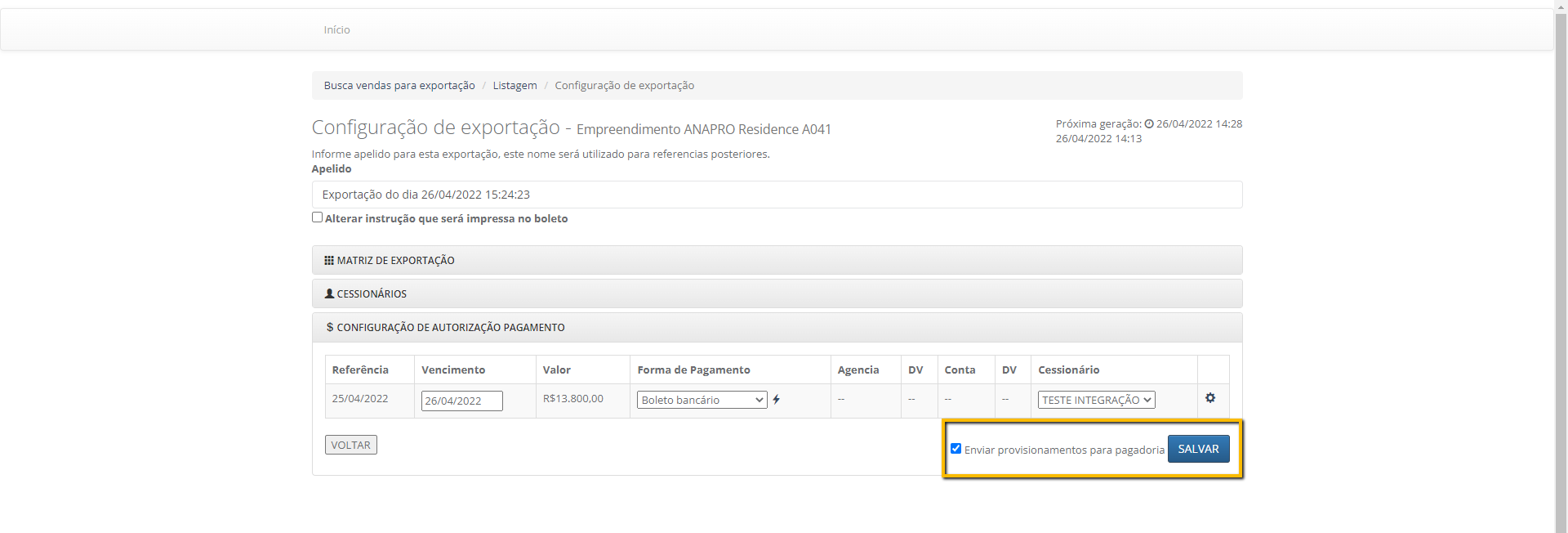 Após conferir essas informações ao lado do botão "Salvar" tem uma opção "Enviar provisionamentos para pagadoria", você irá selecionar ela e logo em seguida clicar em "Salvar". Feito isso os boletos serão enviados para o email que está cadastrado na ficha de cadastro do cessionário, e todas as informações da distribuição de pagamentos será enviada para o Banco Paulista processar.