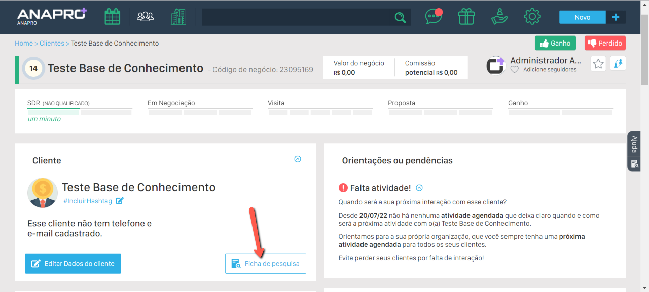 A ficha de pesquisa ficará disponível dentro do atendimento, basta clicar em "Ficha de pesquisa".