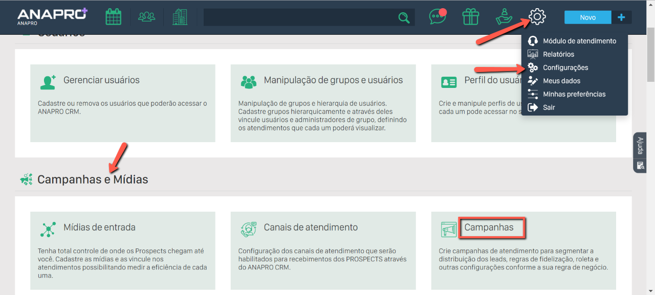 Em seguida, procure por "Campanhas", localizado no bloco "Campanhas e Mídias", no início da página.