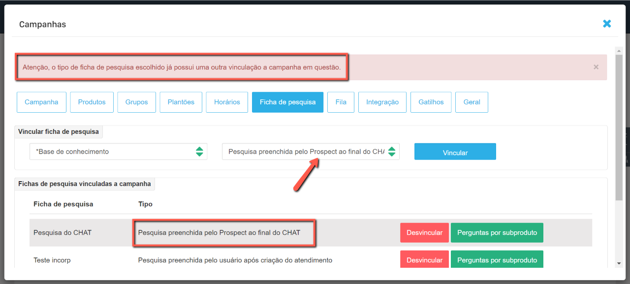 Por exemplo: se você tentar vincular duas fichas definidas para serem preenchidas ao final do chat na mesma campanha, o sistema exibirá uma mensagem de erro e não permitirá a ação.