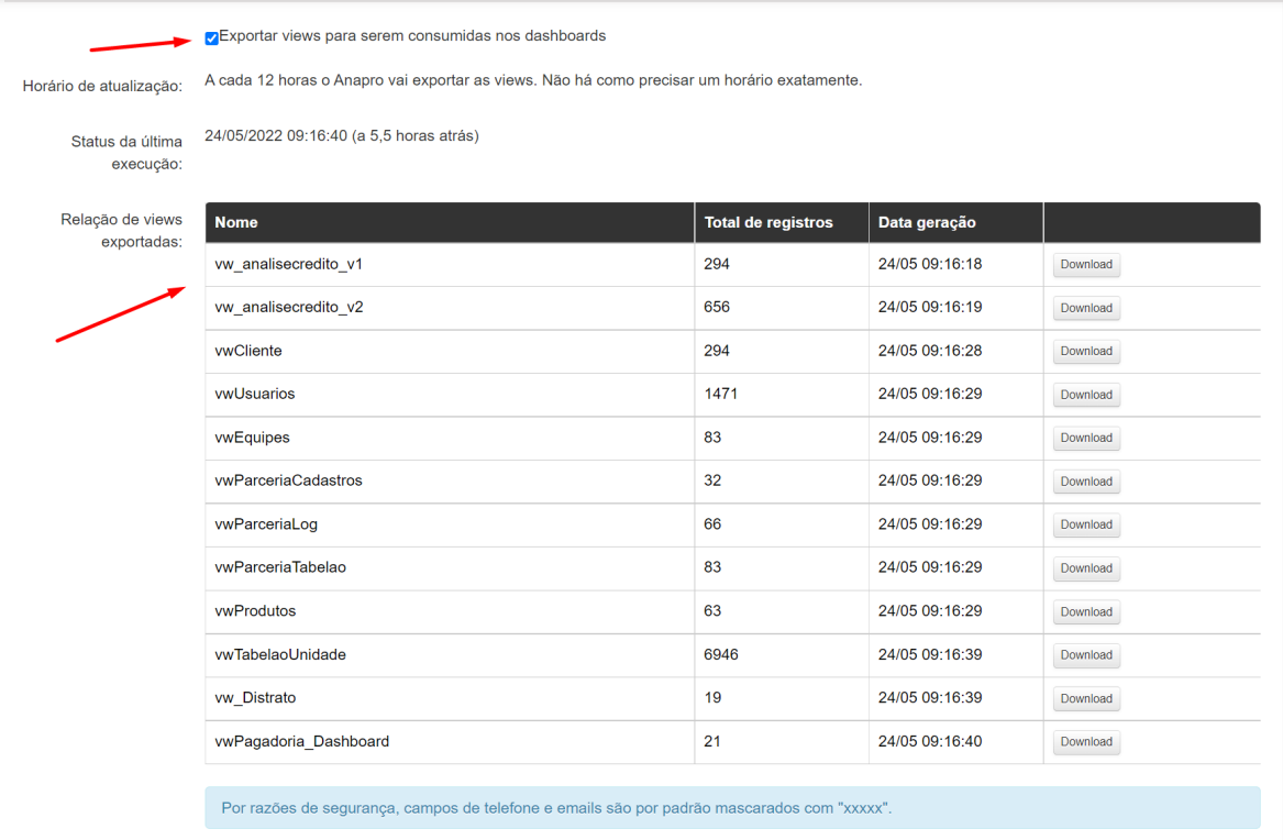 No menu Administração > Outras Opções > Dashboard & BI > Configuração exportação de views é necessário que a flag esteja ativada, e também que haja a relação das views disponíveis. Se a flag estiver marcada e não tiver a relação das views significa que após marcar a flag não houve atualização para essa construtora, recomendamos aguardar a primeira atualização. Ao marcar a primeira vez a primeira atualização deverá acontecer no dia seguinte, conforme abaixo.