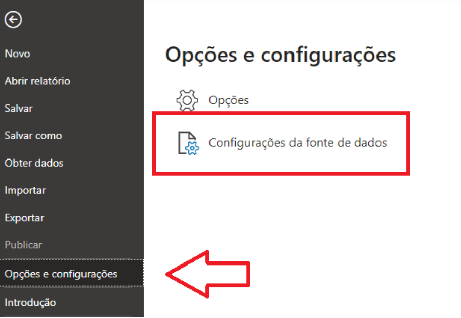 Caso haja a necessidade de alterar as credenciais de acesso da API, basta clicar em Arquivo > Opções e configurações > Configurações da fonte de dados.