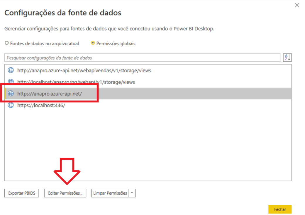 Selecione a fonte de dados correta e clique em "Editar Permissões".