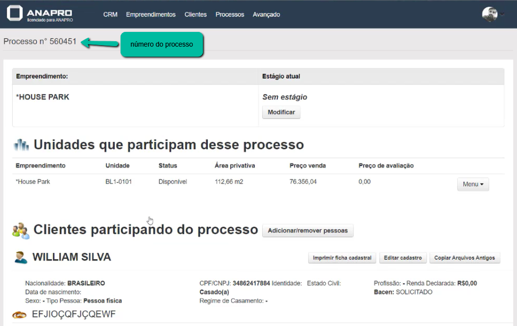 Após criado, a página com todas as informações do mesmo será exibida para você com o número, informações do(s) cliente(s), estágio em que se encontra, quais unidades estão vinculadas (caso haja), documentação anexada, entre outras coisas.