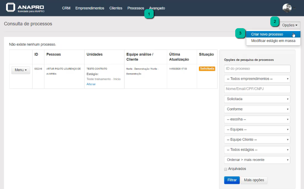 Para isso, acesse Processos e clique em Opções > Criar novo processo.