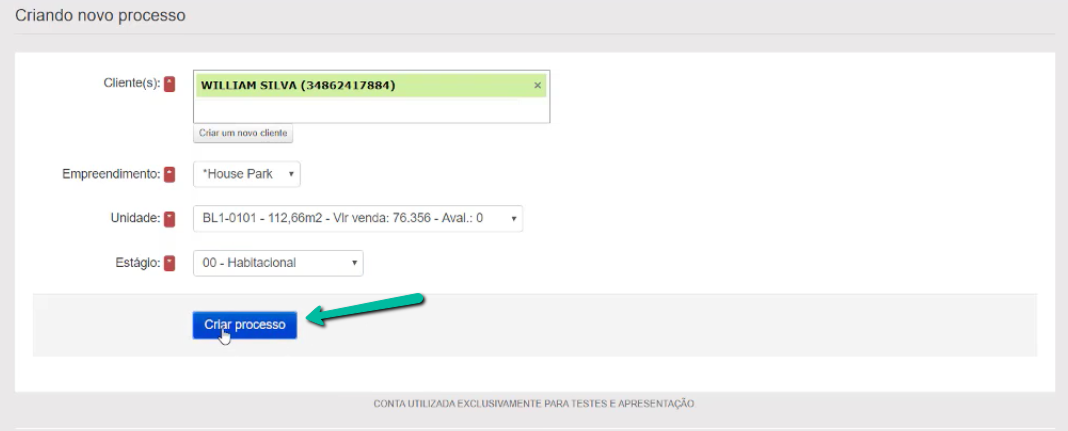 Preencha os campos requisitados. No exemplo que estamos demonstrando, foram habilitados todos os campos para criação do processo (cliente, empreendimento, unidade e estágio). Mas não necessariamente irão aparecer para você todas estas opções. É possível cadastrar clientes também através desta página, basta selecionar o botão correspondente abaixo da seleção de nome do cliente.