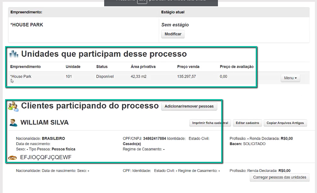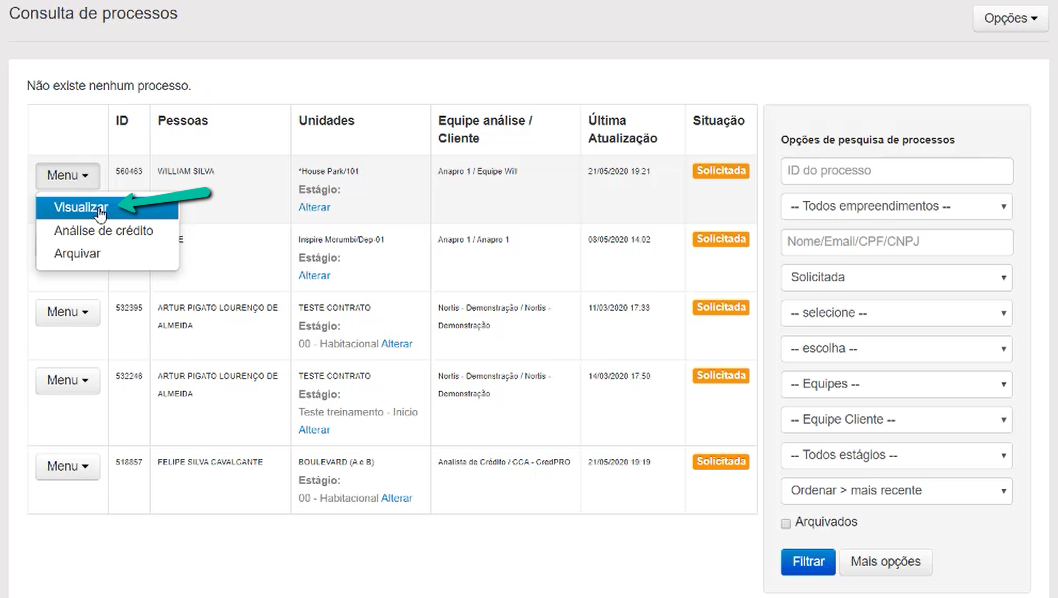 Localizando o processo que precisa ser analisado, (é possível também ser direcionado ao mesmo através da notificação enviada por e-mail) selecione a opção Menu > Visualizar. Desta forma será exibida a tela com todas as informações referente ao(s) cliente(s) como unidade vinculada e dados pessoais.