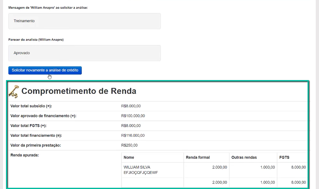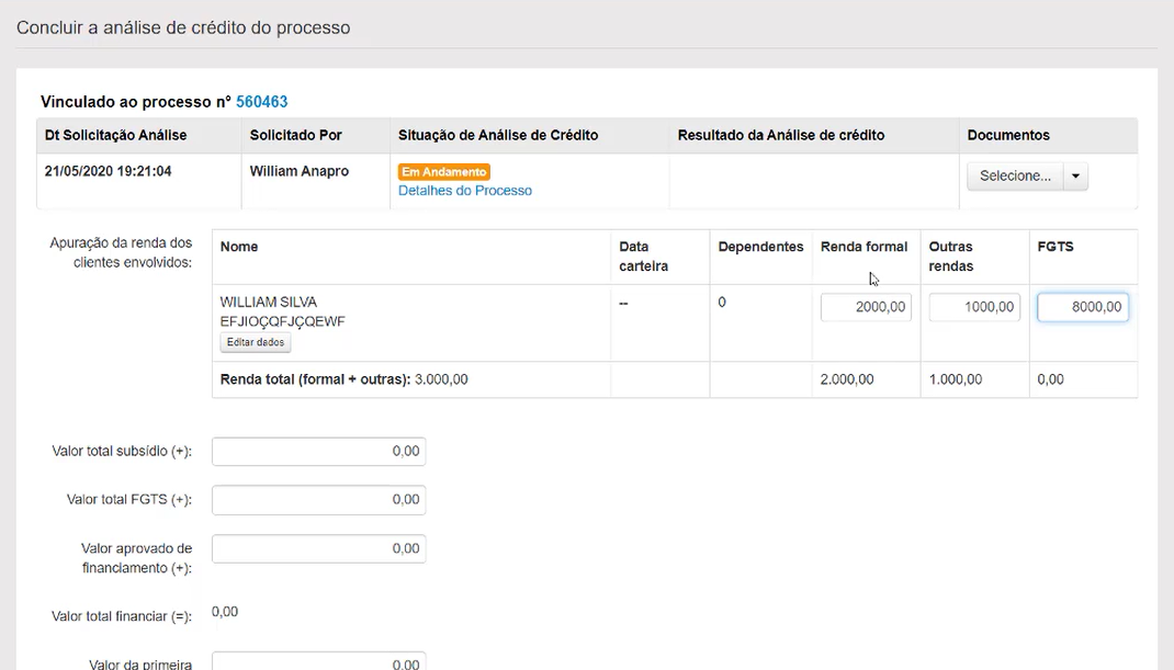 Iniciando a análise no botão “Iniciar análise de crédito”, o sistema altera o status da mesma para “Em andamento” e será possível incluir todas as informações referentes à renda do cliente (FGTS, subsídio e valor de financiamento, por exemplo).
