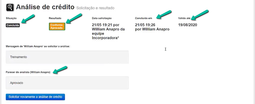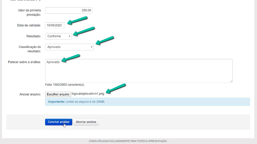 Após incluir as informações, você poderá selecionar até quando essa análise será válida pela data de validade e o qual o resultado da mesma, se aprovada ou reprovada, incluindo também um parecer para a mesma.