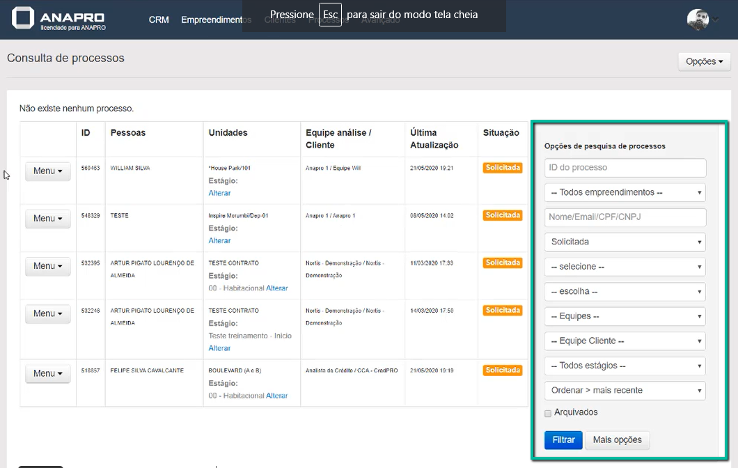 Na aba “Processos” é possível procurar (de acordo com as permissões do seu usuário) processos de várias equipes e empreendimentos diferentes, inclusive de situações (análise não solicitada, pendente, em andamento e/ou concluída, por exemplo).