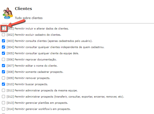 Depois de clicar no menu "Editar" você irá se deparar com os agrupamentos de permissões, cada agrupamento liberar algum acesso específico no sistema, como por exemplo: Cadastramento de cliente, você irá procurar pelo agrupamento "Clientes" que no qual irá marcar a opção que permite com que o usuário faça a inclusão do cliente.
