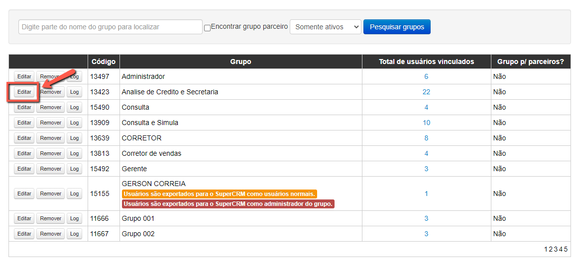 Após isto, você irá localizar o perfil que deseja ajustar a permissão de acesso, clicando em "Editar".