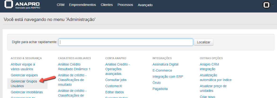 Dentro do menu de "Administração" irá procurar pela opção "Gerenciar grupos usuários".