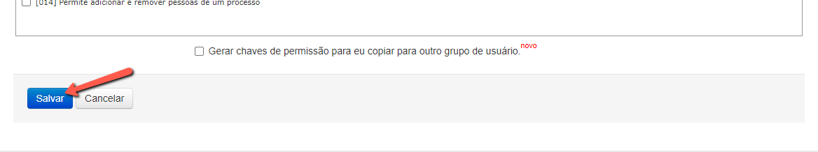 Ao localizar a permissão que o grupo precisa ter, basta marcar a mesma e após isto, vá até o final da página e clique em "Salvar". Para constar quaisquer alterações nos perfis, o recomendável é que o usuário saia do sistema e entre novamente.