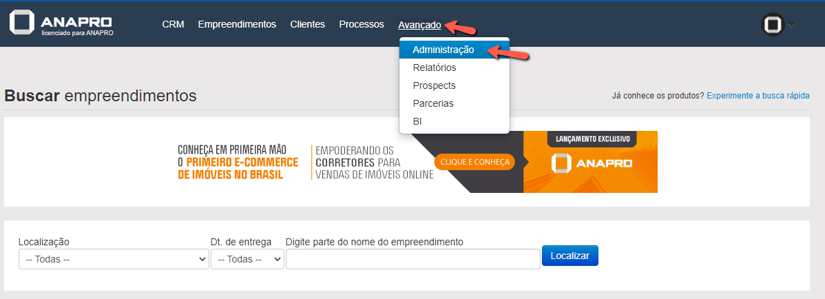 Clique no menu Avançado > Administração.