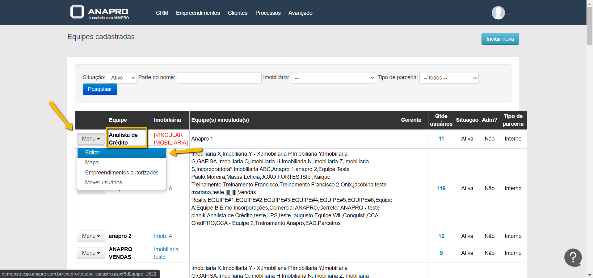 Feito isso iremos selecionar a equipe clicando em Menu > Editar.