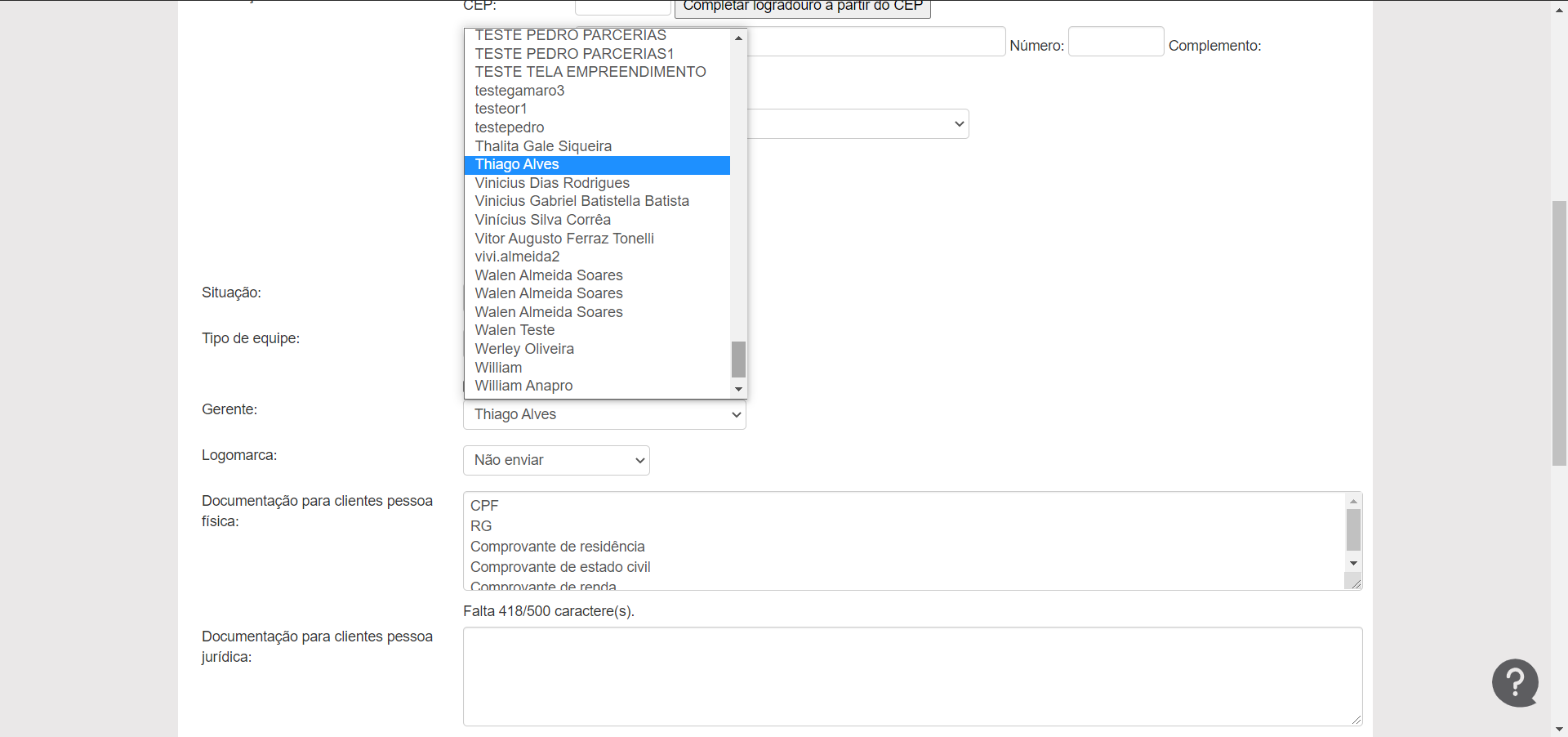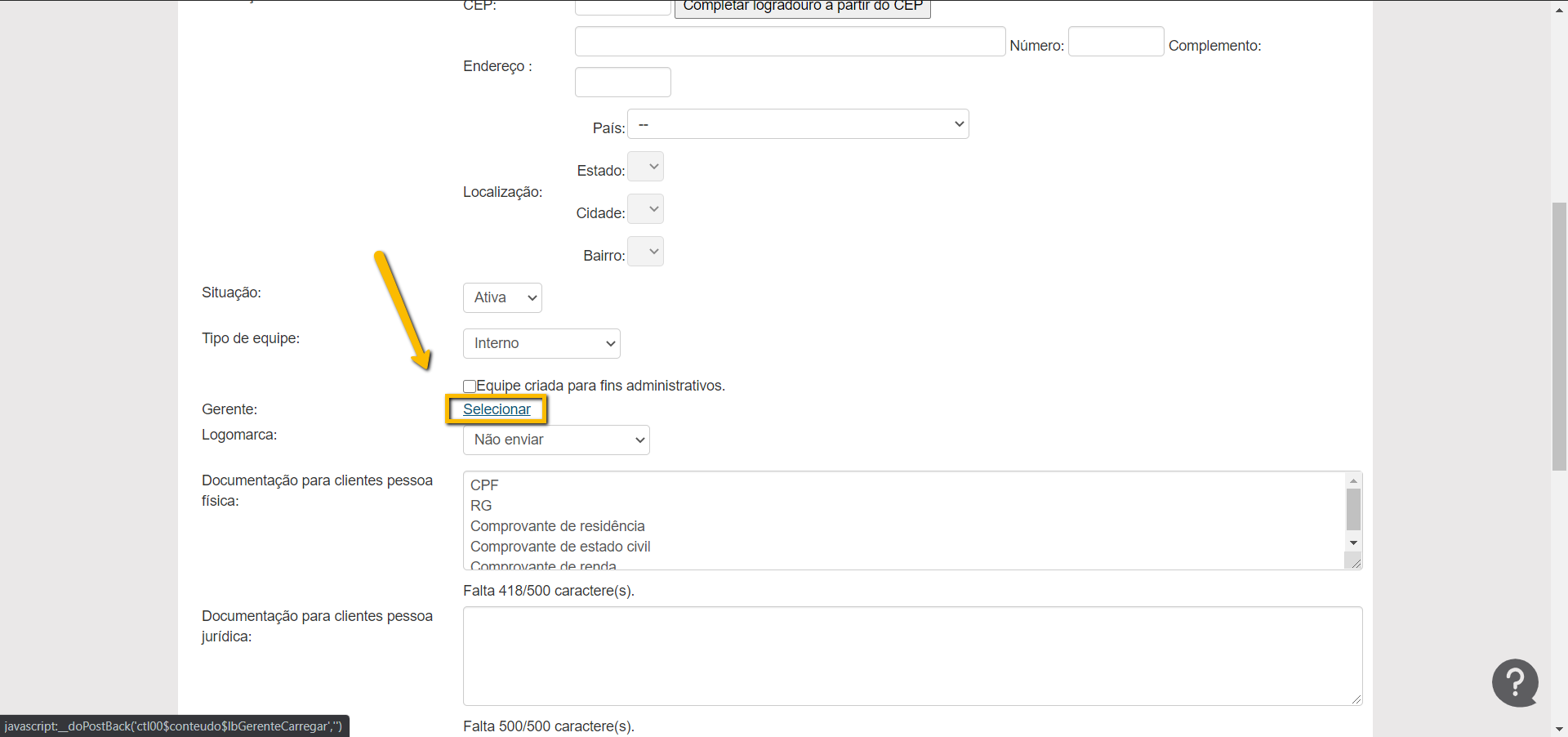 Iremos agora descer a pagina e encontrar a parte onde selecionamos o gerente.