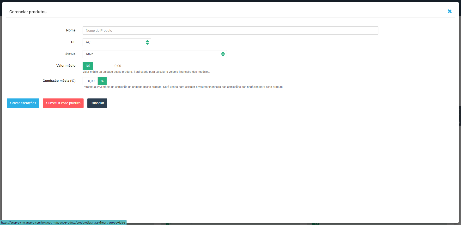 Você será levado à página de cadastro do produto. Insira o nome do produto e a UF onde ele está localizado. Os campos de valor médio e comissão são opcionais e não obrigatórios.