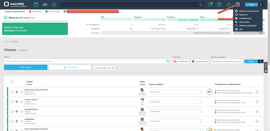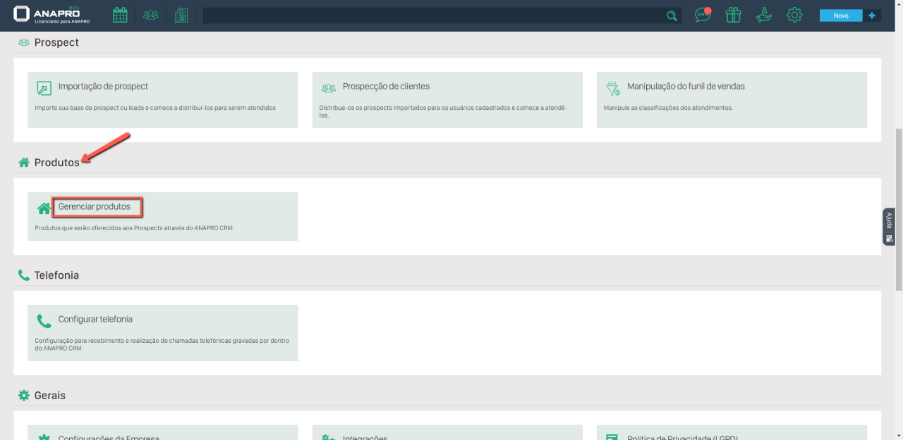 Neste artigo, iremos abordar como cadastrar produtos no Anapro CRM. Primeiramente, clique na engrenagem e selecione "Configurações":