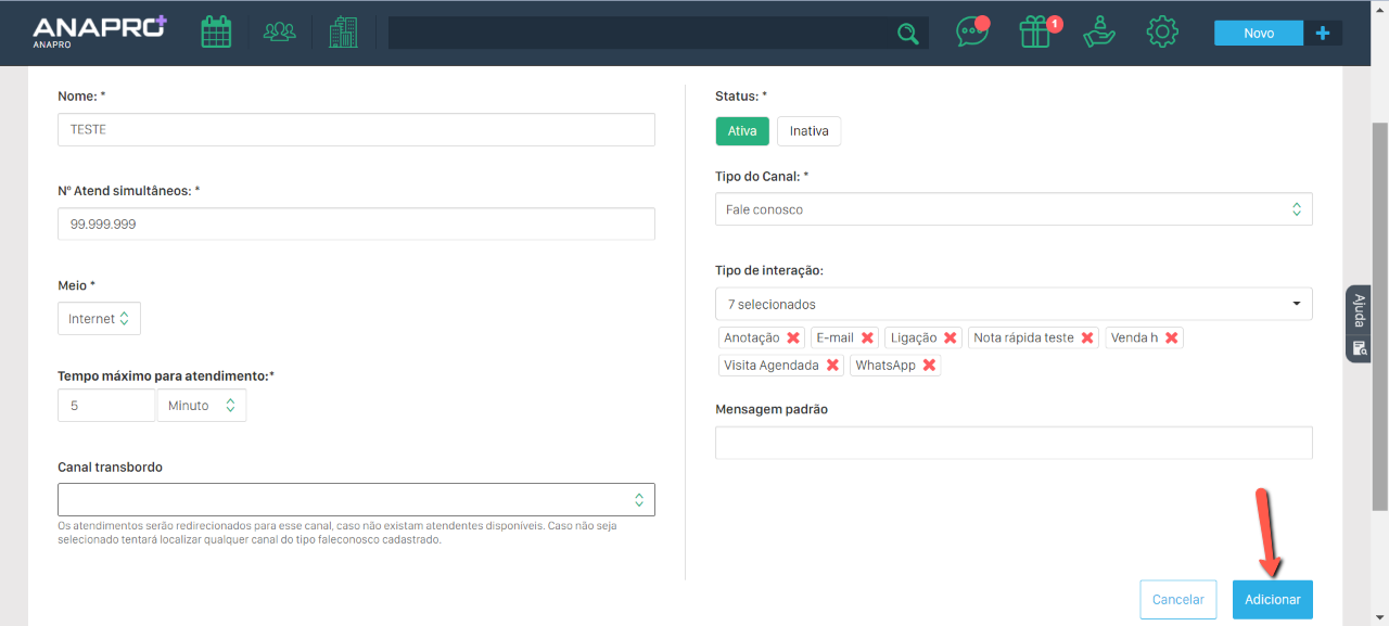 Você será direcionado para a página de cadastro do canal. Preencha as seguintes informações: nome do canal, quantidade de atendimentos simultâneos (normalmente deixamos como ilimitado, ou 99999999), meio (internet ou outro), tempo máximo para atendimento e canal de transbordo.