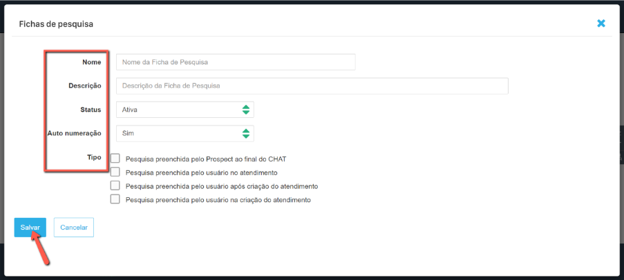 - Na página de cadastro, insira o nome da ficha (obrigatório para identificação futura), uma descrição (opcional), o status, se a numeração será automática e o tipo de ficha (quando deve ser preenchida).