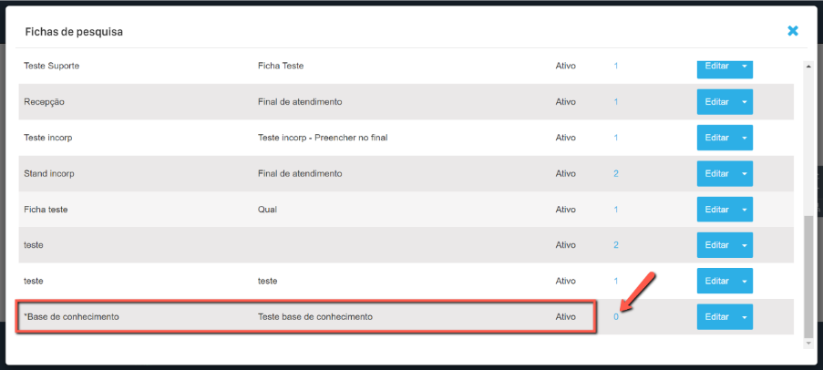 Após salvar a ficha, você será redirecionado para a página de perguntas. Identifique a ficha criada e clique no número exibido na coluna "Perguntas" (começa como 0).