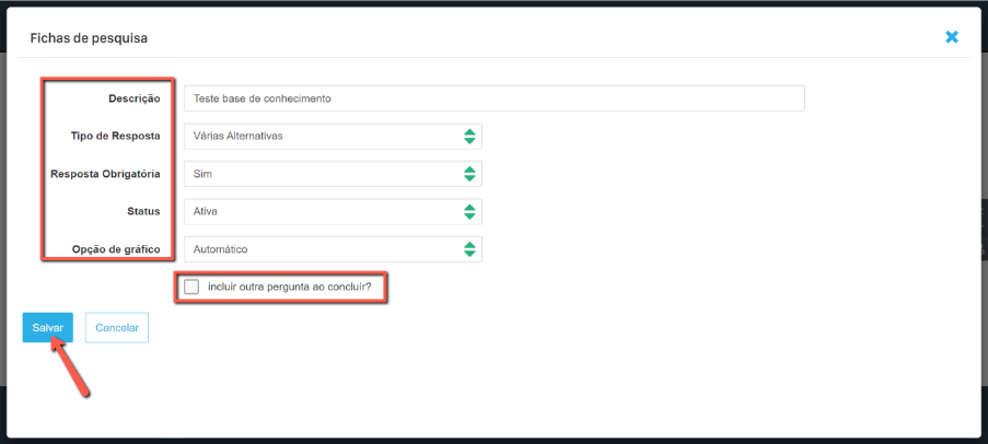 - Após preencher, você pode optar por incluir outra pergunta ou clicar em "Salvar".