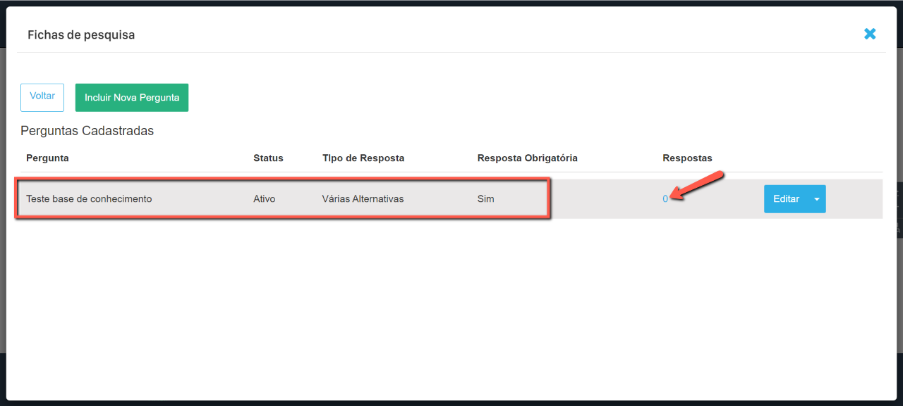Após cadastrar a pergunta, você será direcionado para a listagem de perguntas. Clique no número 0 na coluna "Respostas" para adicionar respostas.