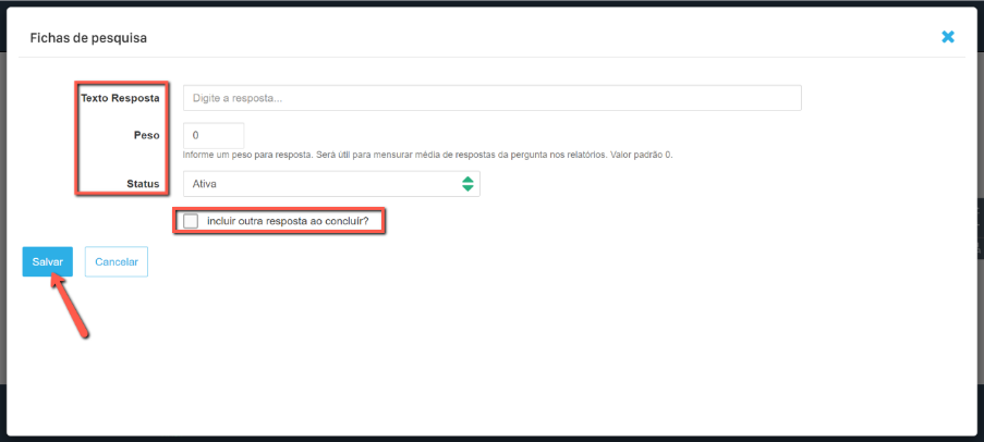 - Preencha o campo "Texto Resposta" com a resposta desejada, defina o esquema de peso se aplicável, e ajuste o status.