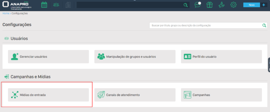 Na seção de configurações, localize a opção "Mídias de entrada" logo abaixo de "Gerenciar usuários". Ao selecionar essa opção, você terá acesso a todas as mídias disponíveis no CRM, como ilustrado na imagem: