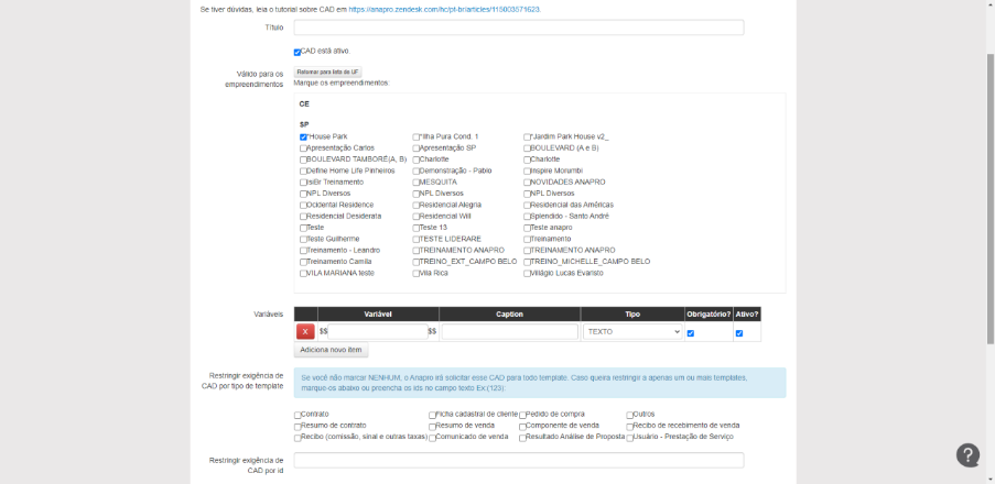 A tela de edição e criação de um novo CAD são iguais. Clicando para inserir um novo CAD, iremos preencher o título, selecionar o(s) empreendimento(s) que se aplicará, definir a(s) variável(is), escolher se o preenchimento é obrigatório ou não e definir quais os documentos que serão solicitados o preenchimento daquele CAD.