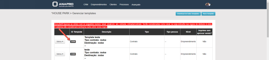 Para saber qual o código do template que irá se aplicar (campo de restringir exigência de CAD por id), basta fazer o seguinte caminho: outras opções (do empreendimento) > gerenciar templates. A informação estará na segunda coluna, denominada "ID Template".