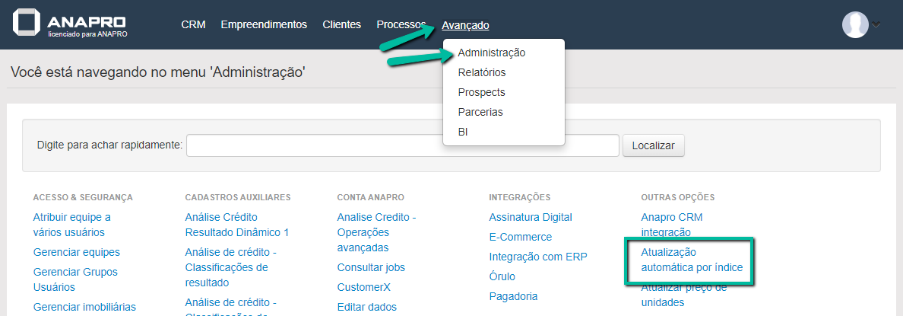 Para isso, acesse Avançado > Administração > Atualização Automática Por Índice.