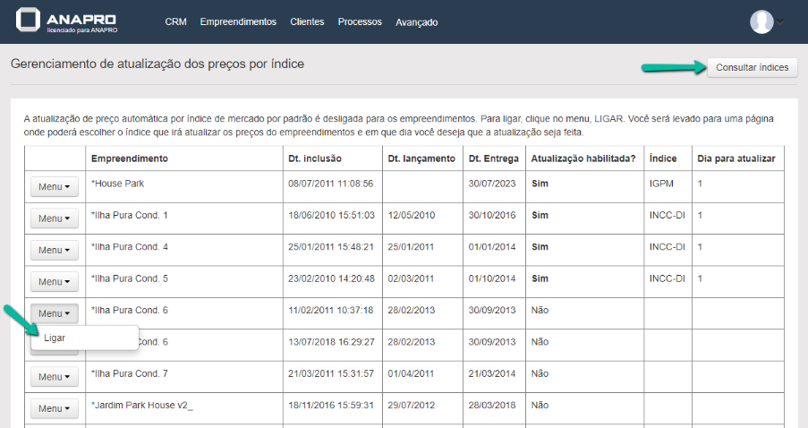 Na próxima tela você poderá consultar o histórico de índices que o sistema está utilizando para atualizar os preços, e ligar/desligar a atualização.
