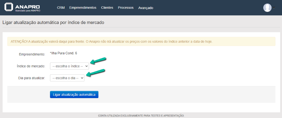 Escolha qual o índice de mercado que deseja utilizar (IGPM, INCC-DI, INCC-M ou IPCA), o dia e ligue a atualização.