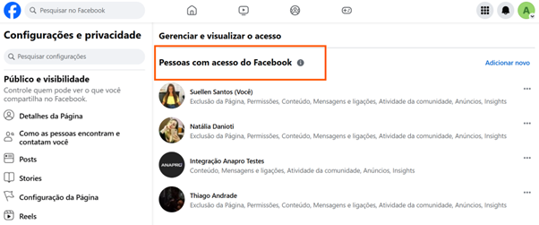 Em “Pessoas com acesso do Facebook” precisa estar adicionado o Facebook da pessoa que logou no Anapro CRM.
